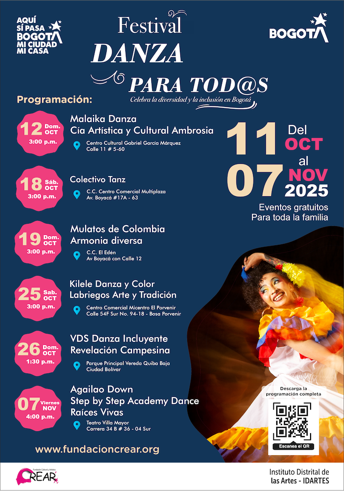 Del 12 de octubre al 7 de noviembre del 2025, Bogotá vibrará con el Festival Danza para Tod@s, un encuentro que celebra la diversidad y la inclusión a través de la danza.